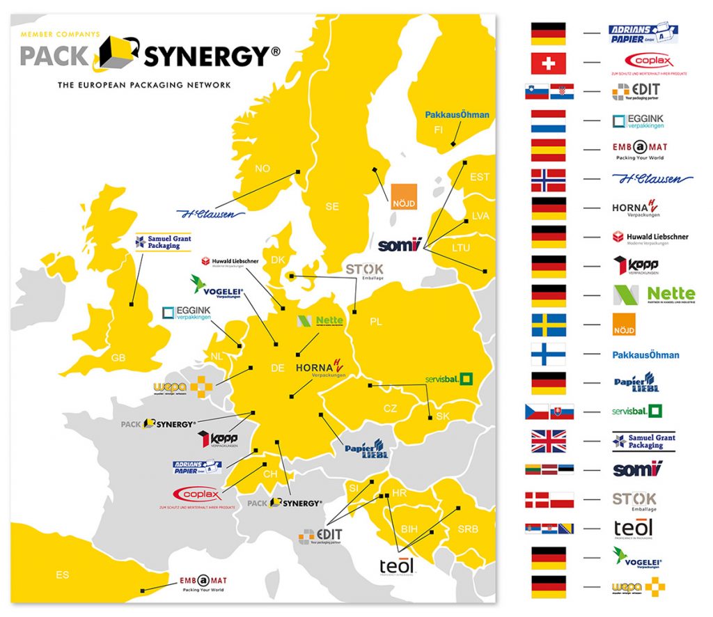 mit Zentralllager und über 27 Standorten in Deutschland, Tschechien, Slowenien, der Slowakei, Serbien, Dänemark, UK, Spanien, den Niederlanden, der Schweiz, Schweden und im Baltikum garantiert die PackSynergy regionale Kompetenz, kurze Wege und eine europaweit optimale Versorgung.